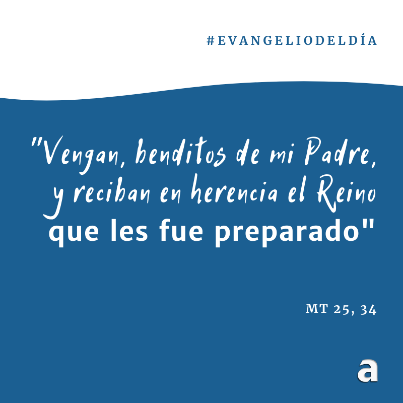 Jesús dijo a sus discípulos: "Cuando el Hijo del hombre venga en su gloria rodeado de todos los ángeles, se sentará en su trono glorioso. Todas las naciones serán reunidas en su presencia, y él separará a unos de otros, como el pastor separa las ovejas de los cabritos, y pondrá a aquellas a su derecha y a estos a su izquierda. Entonces el Rey dirá a los que tenga a su derecha: 'Vengan, benditos de mi Padre, y reciban en herencia el Reino que les fue preparado desde el comienzo del mundo, porque tuve hambre, y ustedes me dieron de comer; tuve sed, y me dieron de beber; estaba de paso, y me alojaron; desnudo, y me vistieron; enfermo, y me visitaron; preso, y me vinieron a ver'. Los justos le responderán: 'Señor, ¿cuándo te vimos hambriento, y te dimos de comer; sediento, y te dimos de beber? ¿Cuándo te vimos de paso, y te alojamos; desnudo, y te vestimos? ¿Cuándo te vimos enfermo o preso, y fuimos a verte?'. Y el Rey les responderá: 'Les aseguro que cada vez que lo hicieron con el más pequeño de mis hermanos, lo hicieron conmigo'.