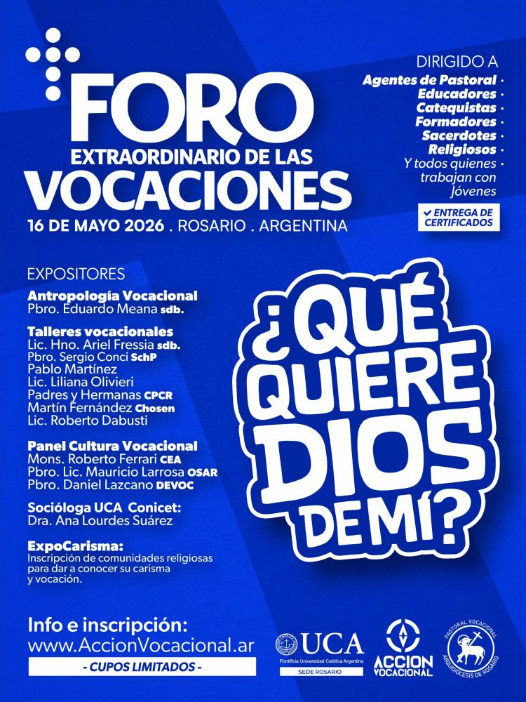 La ciudad de Rosario será anfitriona del Foro Extraordinario de las Vocaciones: una jornada para profundizar el trabajo vocacional con los jóvenes, que se desarrollará el sábado 16 de mayo de 8 a 18, en la sede de la Universidad Católica Argentina (UCA) con sede en esa ciudad. (Av. Pellegrini 3314).