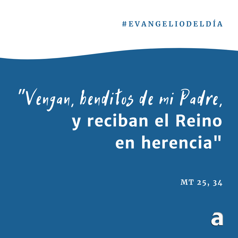 Jesús dijo a sus discípulos: "Cuando el Hijo del hombre venga en su gloria rodeado de todos los ángeles, se sentará en su trono glorioso. Todas las naciones serán reunidas en su presencia, y él separará a unos de otros, como el pastor separa las ovejas de los cabritos, y pondrá a aquellas a su derecha y a estos a su izquierda. Entonces el Rey dirá a los que tenga a su derecha: 'Vengan, benditos de mi Padre, y reciban en herencia el Reino que les fue preparado desde el comienzo del mundo, porque tuve hambre, y ustedes me dieron de comer; tuve sed, y me dieron de beber; estaba de paso, y me alojaron; desnudo, y me vistieron; enfermo, y me visitaron; preso, y me vinieron a ver'. Los justos le responderán: 'Señor, ¿cuándo te vimos hambriento, y te dimos de comer; sediento, y te dimos de beber? ¿Cuándo te vimos de paso, y te alojamos; desnudo, y te vestimos? ¿Cuándo te vimos enfermo o preso, y fuimos a verte?'. Y el Rey les responderá: 'Les aseguro que cada vez que lo hicieron con el más pequeño de mis hermanos, lo hicieron conmigo'. Luego dirá a los de su izquierda: 'Aléjense de mí, malditos; vayan al fuego eterno que fue preparado para el demonio y sus ángeles, porque tuve hambre, y ustedes no me dieron de comer; tuve sed, y no me dieron de beber; estaba de paso, y no me alojaron; desnudo, y no me vistieron; enfermo y preso, y no me visitaron'. Estos, a su vez, le preguntarán: 'Señor, ¿cuándo te vimos hambriento o sediento, de paso o desnudo, enfermo o preso, y no te hemos socorrido?'. Y él les responderá: 'Les aseguro que cada vez que no lo hicieron con el más pequeño de mis hermanos, tampoco lo hicieron conmigo'. Estos irán al castigo eterno, y los justos a la Vida eterna".